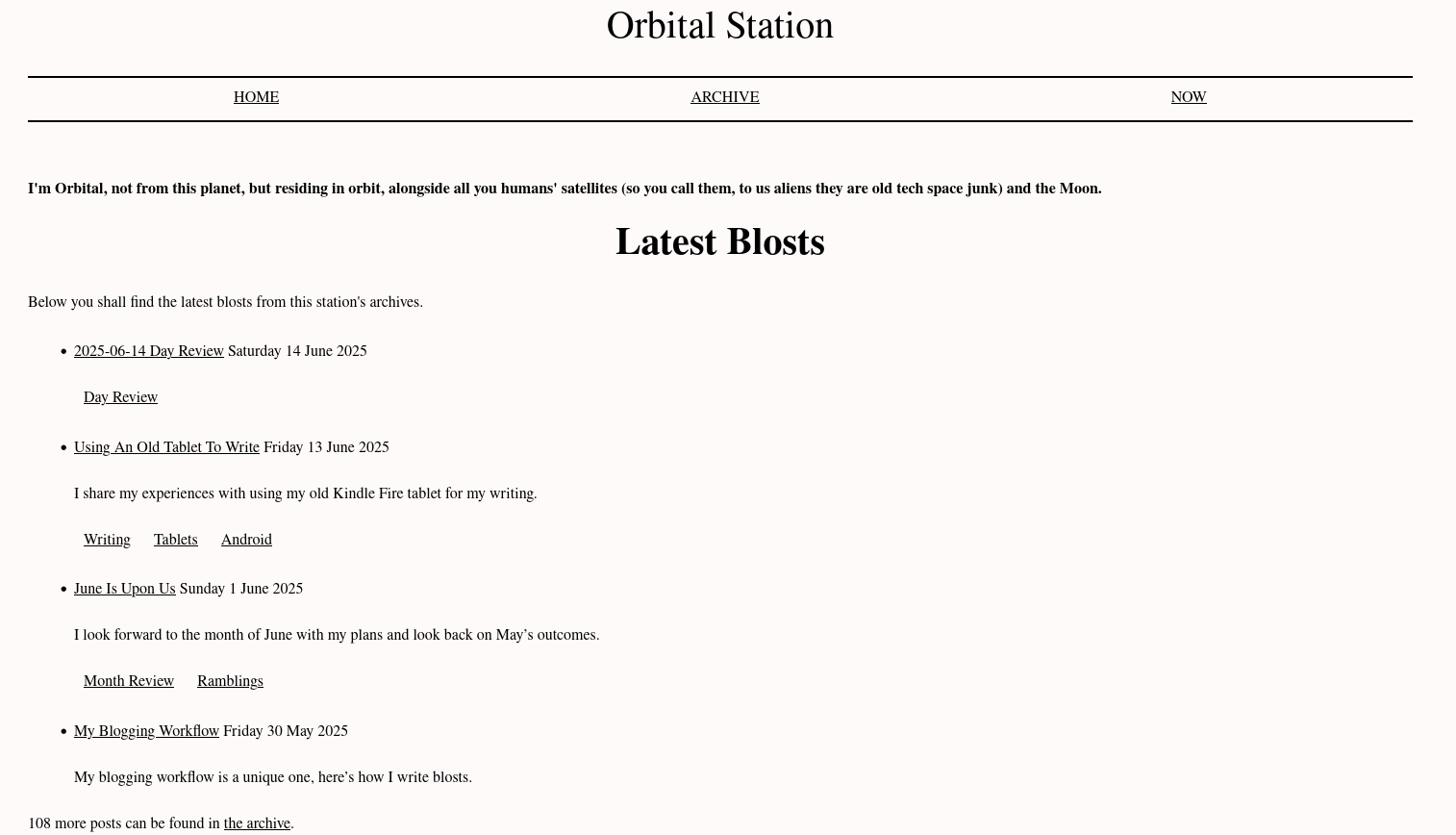 I started making a website back in 2021, but it never really went anywhere (this was back before my name was OrbitalMartian). In July/August 2023, I rebranded my online persona to OrbitalMartian and decided to get a website set up properly to write blog posts. My first website was made with 11ty and just used the base theme. I wrote a couple of bad blosts while I found my footing with the new persona, and now I'm writing more frequently and enjoying it more.