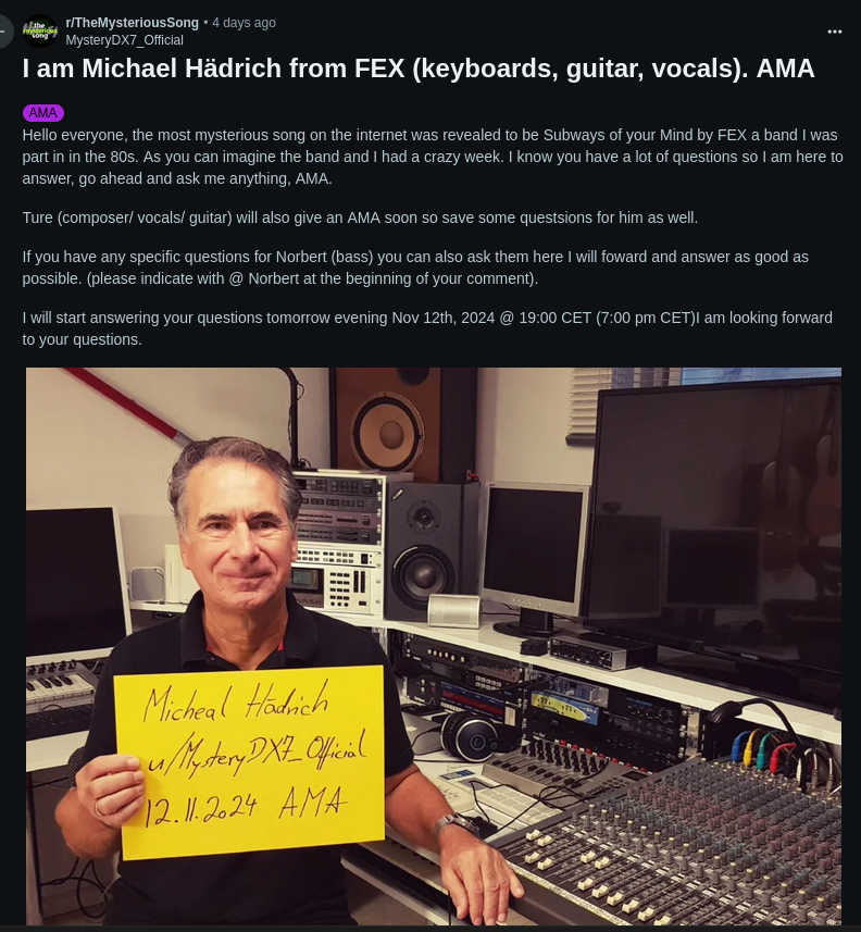 - MIchael's AMA: reddit.com/r/TheMysteriousSong/comments/1gon5k1/i_am_michael_hädrich_from_fex_keyboards_guitar